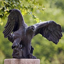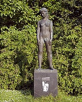 En portrætlignende og atletisk kvindefigur i bronze på en sokkel af blå rønnegranit, muligvis et portræt af kunstnerens kone.