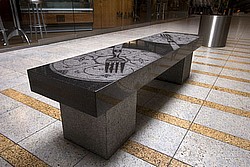 19 håndhuggede bænke i poleret blågrøn granit med forskellige motiver, herunder en forstørret 200-kroneseddel, et uldsweater-mønster og børnetegninger.