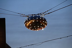 En installation af lyslederkabler, der hænger i loftet ved Café Vivaldi.