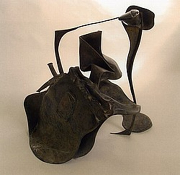 En groft modelleret bronzefigur af en nøgen kvinde, der hænger på hovedet. Værket kan tolkes som en kommentar til forbrugersamfundet eller et forsøg på at “sætte kunsten på hovedet”.